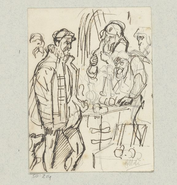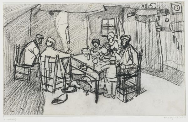 Editor: So, this is "Boereninterieur met vier mensen etend rond een tafel," or "Farmer's Interior with Four People Eating Around a Table," by Henri Wouters, dated between 1876 and 1932. It's a graphite drawing on paper. There's something very stark and intimate about it at the same time. What strikes you when you look at this piece? Curator: What stands out for me is how Wouters depicts everyday life with such raw honesty. Considering the period, the late 19th to early 20th century, this interior scene speaks volumes about class and labor. Do you notice the austerity of the setting? It hints at the socio-economic conditions of the working class. Editor: I do see that now that you point it out. The sketchiness almost emphasizes a lack of refinement. Is it a critique? Curator: Possibly, or perhaps a raw representation devoid of romanticism. Think about realism as a movement and its intersection with early socialist thought. How does this contrast with the glorified depictions of rural life that were common at the time? The lack of idealization prompts us to think about the labor and hardship inherent in the lives of these farmers. Also, what can we infer from the seating arrangement around the table? Editor: I suppose it shows equality, that everyone gets a seat at the table despite gender or age differences. Curator: Precisely! Or perhaps it just a fact of peasant life. But consider how it promotes a kind of social awareness, presenting the figures without artificial enhancements or glorification. It serves as a document of their time. The setting is humble but equal, offering insights into the values and conditions of this group. Editor: It's incredible how much is communicated through such a simple sketch. I am starting to think that maybe all art has some type of underlying activism and social narrative if we really delve into the context surrounding it. Curator: Indeed. Looking closely can teach us so much about the communities surrounding the artist.