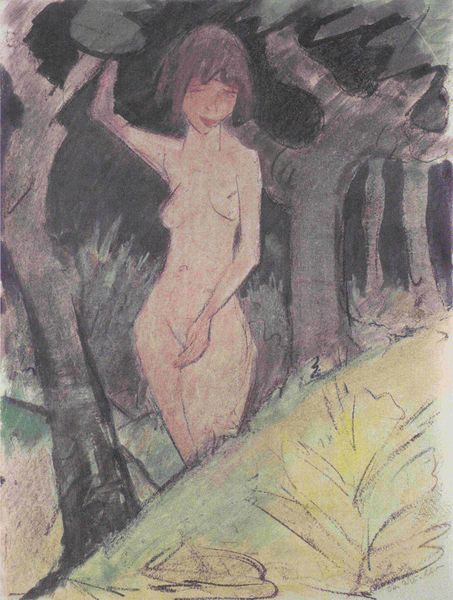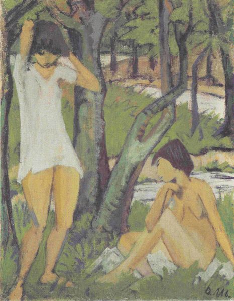 Otto Mueller made this painting, "Sitzender Akt Unter Bäumen," with tempera on canvas. You can see how the marks are laid down one next to the other, like a careful construction. It reminds me that paintings aren't just images; they're built. There's something really intriguing about the way Mueller uses color here. The palette is muted, almost dreamlike, with soft greens and grays dominating the landscape. This restraint gives it a unique emotional tone. Look at the way the nude figure blends into the landscape, almost becoming part of the trees and foliage. The figure isn't the focal point but part of the whole. This reminds me a little of Paula Modersohn-Becker's work; both artists were doing something similar regarding form and the figure. It makes you wonder about the conversations happening between artists then, an exchange of ideas and influences across time. Art's not about fixed meanings but about the ongoing dialogue and exploration.