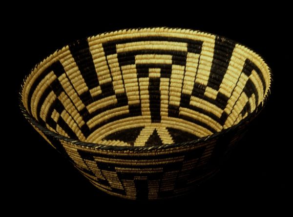 The Tohono O'odham (Papago) and Akimel O'othom (Pima), together referred to as Pimans, live in a large area of the Southwest including, central Arizona and extending down into Sonora, Mexico. Tohono O'odham translates to "desert people" and Akimel O'othom to "river people." They are essentially one people with minor differences in culture, dialect and environment. Baskets have been an integral part of their daily lives. Their baskets were so tightly woven that they could be used to transport water or as basins for washing. Additionally, baskets were used for storing and preparing food. Large shallow bowls, such as this one, were the most common form. Traditionally, the Pimans use splints of bear grass or cattail to make coils that are stitched with devil's claw and willow. The classic Piman basket has an abstract, geometric design that is built out from the center black disc in a radiating or whirling pattern.