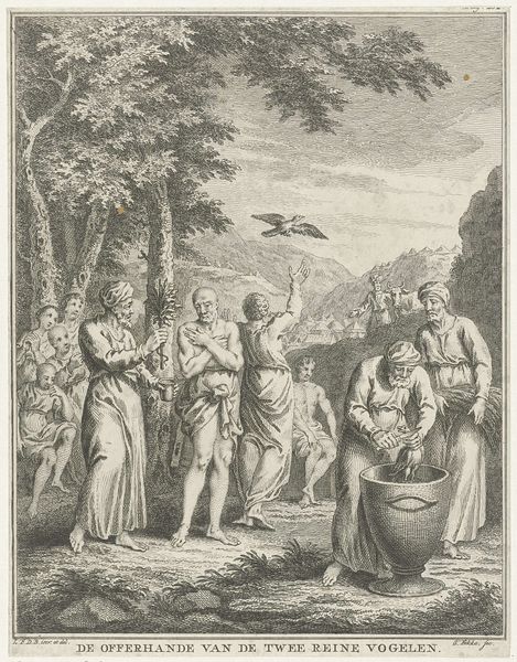 Editor: So this engraving, "Christ and the Samaritan Woman," by Jacob Matham, made around 1589, has a lot going on! I’m really struck by how theatrical it feels, almost like a stage set, but I am confused about the choice of showing Jesus asking for water as it feels like an attempt to humanize him. What's your read on it? Curator: I see this piece as deeply embedded in the social and religious upheavals of the late 16th century. The Reformation had profoundly altered the landscape of religious imagery, particularly in the Netherlands. Depictions of biblical scenes were no longer solely the domain of the Church; they entered the public sphere, often carrying specific ideological messages. Matham, working within this environment, seems to engage with the renewed emphasis on personal piety and biblical literacy promoted by Protestant reformers. The scene, set against a detailed landscape, removes it from the distant, idealized past, grounding it in a recognizable reality. What strikes me is not just the humanization of Christ, but also the positioning of the viewer. Does it not feel like an invitation to witness—and perhaps even participate in—a transformative encounter? Editor: That makes sense. The setting and the almost contemporary dress really do make it feel…present. But what about the Mannerist elements, like the almost exaggerated musculature of the figure drawing water, which could make this look as propaganda? Curator: Exactly! It's a negotiation between artistic style and socio-political function. Mannerism, with its emphasis on artifice and drama, could be a powerful tool for conveying religious narrative in a compelling way, drawing viewers into the scene. But that being said it does reinforce this tension between artistic expression and ideological agenda, revealing the complexities of art production within a religiously charged social landscape. Editor: I hadn't considered that balance before! Seeing it as part of the religious climate really adds a whole other layer. Curator: It is always rewarding to analyze artworks in light of how museums and galleries or different socio-political forces shaped their creation and impact.