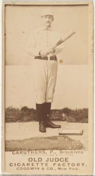 Editor: Here we have "Tommy McCarthy, Center Field, St. Louis Browns," a print from the Old Judge series, dating from 1887 to 1889. It’s actually an advertisement for Old Judge Cigarettes. What strikes me is how staged and formal it feels, almost like a presidential portrait! What's your take on this peculiar little artwork? Curator: It’s more than just a “peculiar little artwork.” Consider the rise of mass media and consumer culture at this time. The image is doing some heavy lifting in terms of promoting both McCarthy, and the cigarette brand. It’s early branding. Think about how celebrity endorsements still work today – this is a direct ancestor. Editor: So, it's about associating the image of a healthy baseball player with a not-so-healthy product. But why a photographic print rather than, say, a drawing or painting? Curator: Exactly! The photograph, even though staged, lent an air of authenticity and modernity. Remember, photography was relatively new and seen as a direct representation of reality, giving a kind of veracity to the advertisement that older media wouldn’t. This wasn’t just about selling cigarettes; it was about selling a lifestyle, associating it with success, athleticism, and the 'American Dream' through someone famous, whose imagery circulated more widely through media culture. What is he wearing, do you notice? Editor: Now that you point it out: his clothing seems oddly formal for a sports figure? And, look, the cigarette company logo at the bottom has nearly equal presence with his name. Curator: The high boots are quite specific to the style and fashion of the era and location. Consider how the visual rhetoric blends ideas of sport, capitalism, and social aspirations. He stands as a paragon that the company sells. These trading cards became wildly popular, reflecting society's growing fascination with celebrity and sports. It is more than just an advertisement, but the early signs of a complex network between media, culture, and commerce. Editor: I never considered that. I see now the ad isn’t just about baseball, but the larger societal context of aspiration and consumption. Thanks! Curator: My pleasure, that kind of complexity is the richness in artworks!