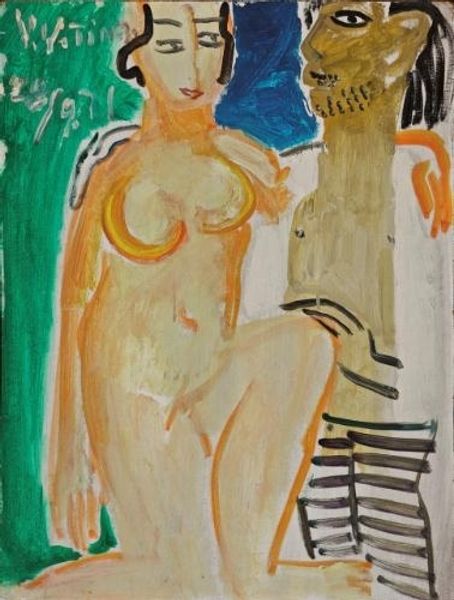 Editor: Here we have Béla Czóbel's 'Akt', painted in 1920 using mixed media. It's striking, the way the figure seems almost to emerge from a swirling background of colours, a seated nude gazing confidently back at the viewer. What do you see in this piece? Curator: I see a moment of Fauvist energy meeting the anxieties of the early 20th century. Consider the context: 1920, Europe is reeling from the aftermath of World War I, and the old certainties are crumbling. This vibrant yet unsettling portrait captures that feeling of disruption and re-evaluation, especially in its raw depiction of the female form. How does it make you feel? Editor: Uneasy, perhaps. The colours are bright, but there’s a sense of melancholy in the subject's expression and in the disjointed composition. Is that something intentional, a reflection of the artist’s state of mind? Curator: Absolutely. Czóbel, like many Expressionists, used colour and form to convey inner states. But I also see a negotiation with tradition. Nudes throughout art history were primarily for the male gaze, right? But Czóbel here gives us a subject with agency, confronting us, not coyly presenting herself. It pushes against traditional, often patriarchal, representations. It challenges what a nude could be at the time. Editor: So it's more than just a stylistic exercise; it’s a statement about power and representation? Curator: Exactly. It's art as activism, using the canvas to disrupt norms and invite dialogue. The artist seems to pose the question: how are we to represent the human body, particularly the female body, after such upheaval? What does it mean to reclaim it from traditional roles and expectation? Editor: That adds a whole new layer to my understanding. I hadn't considered the social and historical context. Curator: It's crucial. Seeing art as a reflection of—and an intervention in—the world around it. Editor: This conversation really opened my eyes; it has broadened my perception of the painting's themes and subtexts, and now I see new and complex avenues for interpretation.