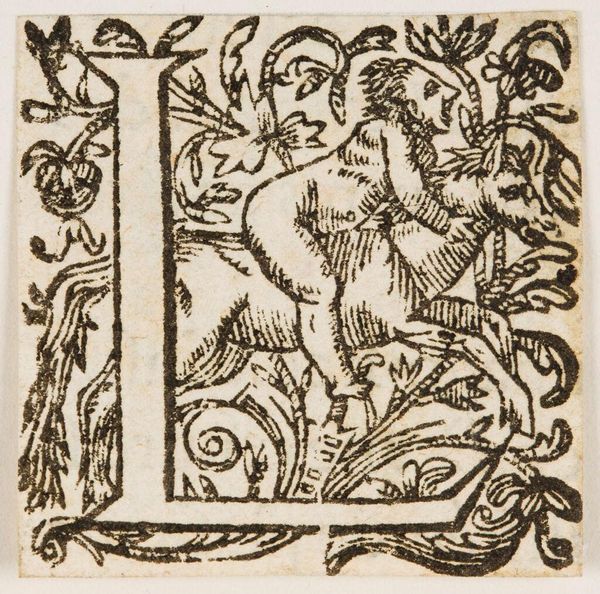 Editor: This is "Letter N", created by an anonymous artist. It looks like it might be a woodcut or engraving. The figure in the middle looks like some kind of saint or prophet, and the letter is highly decorated. What do you make of it? Curator: It sparks a sense of mystery. Perhaps this letter was once part of an illuminated manuscript, a gateway into a medieval tale. The figure's gaze seems knowing, like he's privy to secrets. Look at the way the lines create texture, almost like woven cloth. Editor: So, it's less about the letter itself and more about the story it hints at? Curator: Exactly! It’s a fragment of something bigger, inviting us to imagine the lost context. It's like finding a single, compelling sentence from a novel – full of promise and intrigue. Editor: I never thought of it that way. I was too focused on the letter as just a letter. Curator: That's the magic of art, isn't it? It always has a story waiting to be discovered.