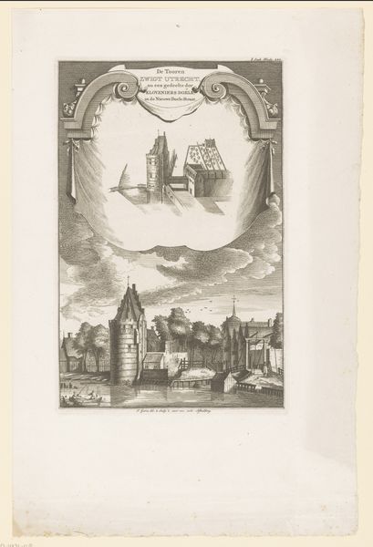 Editor: So, here we have "Het Nieuwe Nonnenklooster te Amsterdam, ca. 1544," an engraving created around 1760 by an anonymous artist, currently held at the Rijksmuseum. I'm struck by how it presents a bird's-eye view within what seems like a draped curtain. How do you interpret the function of an image like this? Curator: This print offers a fascinating glimpse into the intersection of urban planning and religious institutions within Amsterdam’s socio-political landscape. It's important to remember that in the Dutch Golden Age, cities like Amsterdam were centers of commerce *and* religious reform. These kinds of prints served less as 'art' and more as documentation, and sometimes even promotion of civic developments. What do you notice about the prominence given to the cloister within the overall cityscape? Editor: Well, even though it’s called the "New" Nunnery, the engraving almost makes it seem like it's a fortress or a strategically important landmark dominating the area. It feels as if it's intentionally given prominence. Curator: Precisely. These depictions were tools to project power. By showcasing these buildings, even religious ones, authorities solidified their image of control and order. Think about the potential viewers and where these prints would have been displayed - who was this imagery designed to impress? Editor: I suppose merchants and foreign dignitaries would be suitably impressed by Amsterdam's sophistication, showing that even religious places played a part in it. Also, maybe it offered a certain vision of order. Curator: Exactly. Furthermore, the “curtain” element you noted, it adds another layer. What is being unveiled or presented? Who controls this representation, and to what end? Editor: It frames the cloister as something valuable or worthy of display, maybe even legitimising it in a public sphere increasingly concerned with reformed ideals. I see how images, even seemingly straightforward ones, become intertwined with institutional and political power. Thanks for shedding some light! Curator: It goes to show, doesn't it, that even an engraving can be read as a document that shows social priorities and ideologies through the very act of visualizing urban space and its institutions.