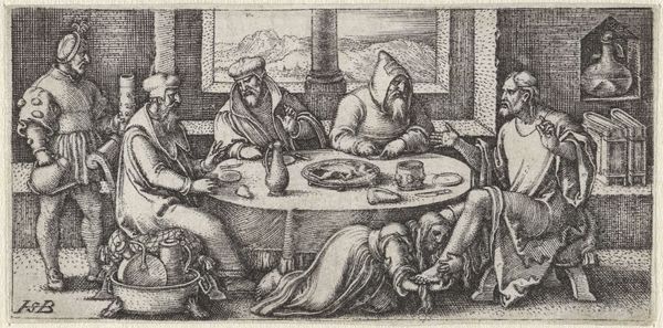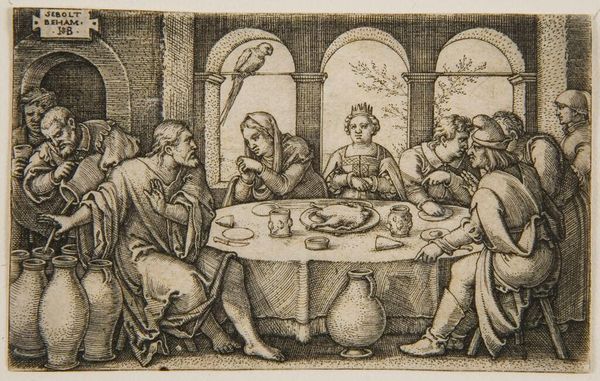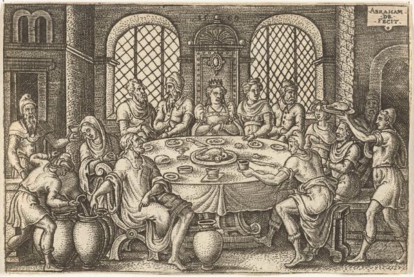 Hendrick Goltzius created this engraving of Urania. The composition is bisected; on the left are a collection of jugs, and on the right is a table of diners. The figures, architecture, and even the bird, appear to be formed of, or captured in, a dense weave of hatching and cross-hatching. The dense, enveloping textures that appear to be rendered from a mathematical, almost algorithmic, process, seem to destabilize any established meanings. Note how the lines form patterns, shaping the objects and figures, but also creating a pervasive surface that unifies the composition. The figures become less about representation and more about an exploration of pattern and form. The artwork challenges fixed meanings, engaging with new ways of thinking about representation. It asks us to see beyond the immediate narrative and to consider the underlying structures of artistic expression. It is through this lens that we begin to appreciate how Goltzius combines artistry with philosophical inquiry.