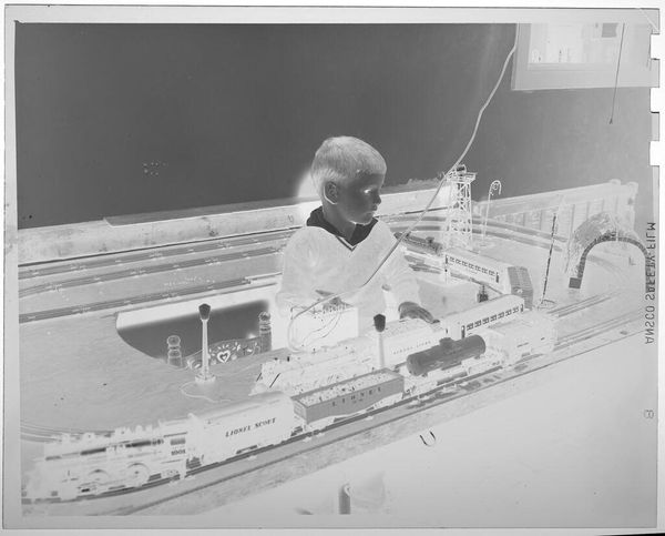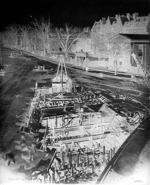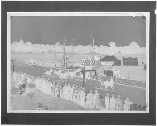Curator: This is an untitled photograph by C. Bennette Moore, showing passengers on board a cruise ship. Its dimensions are roughly 4 by 5 inches. Editor: The stark contrast grabs you immediately. It’s an eerie image; the ghostly figures suggest a sense of transience, a fleeting moment captured. Curator: Note how the flags draw the eye upward, a clever compositional trick. The stark inversion of light and shadow alters our perception of the ship's structure. Editor: It makes me think about who these people were and what this cruise meant to them amidst the era’s social backdrop. A symbol of luxury for some, perhaps? Curator: Perhaps, but the formal elements are what truly resonate. The repetition of the portholes, the linear arrangement of the lifeboats, the geometric precision—it speaks of ordered experience. Editor: I agree there is an alluring tension between leisure and social structures. It feels like an echo of past voyages. Curator: Ultimately, Moore’s photograph prompts one to consider the art of seeing, beyond just depicting. Editor: Yes, and that, along with the narrative of the moment, is what continues to fascinate.