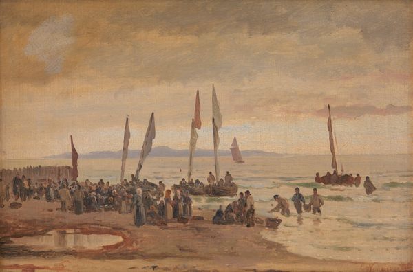 Jacob Maris created this oil on canvas painting, Arrival of the Boats, in the Netherlands. In this scene, we see a community gathered on the shore awaiting the return of fishing boats. The painting, like much Dutch art of the period, reflects a deep connection to the sea, which was central to the Dutch economy and culture. Maris was part of the Hague School, a group of artists who emphasized realism and the everyday lives of ordinary people. The subdued palette and focus on the working class align with the group’s social awareness. Consider the figures: they are not romanticized but shown as weathered by their hard lives. The rider on horseback perhaps represents local authority, overseeing the activity, reflecting the social hierarchy of the time. Art historical research and understanding the socio-economic conditions of the Netherlands at the time can enrich our appreciation for the way this painting captures the essence of a maritime community.