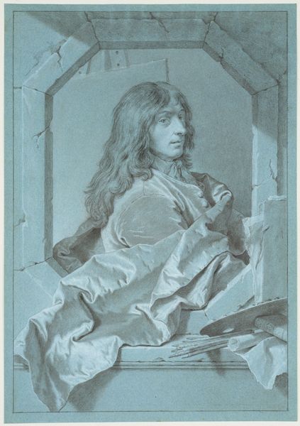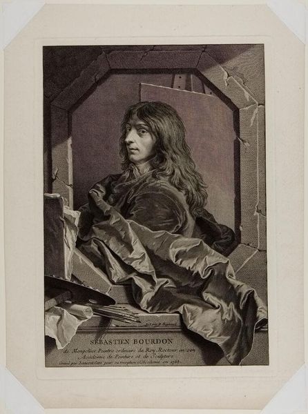 Editor: This is a print of Sébastien Bourdon by Laurent Cars. I’m struck by the setting – this crumbling architectural space, it almost feels like a stage. What symbols do you see here? Curator: The broken frame is telling. It reflects the romantic ideal of the artist as someone wrestling with creation, perhaps at odds with the established order. Notice, too, how Bourdon gazes off to the side, a pose reminiscent of classical muses. What cultural memory does this choice evoke? Editor: Maybe the artist wanted to signal that Bourdon was inspired by the past? Curator: Precisely! And consider the artist’s tools juxtaposed against the rough stone. Doesn't that suggest the power of creation to emerge even in the most unlikely of circumstances? I hadn't thought about it that way before. Editor: Definitely makes you think about the artist’s role in society.