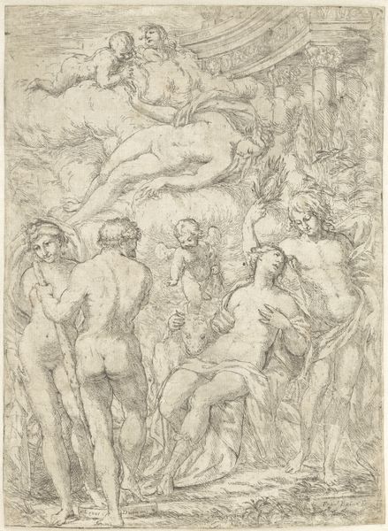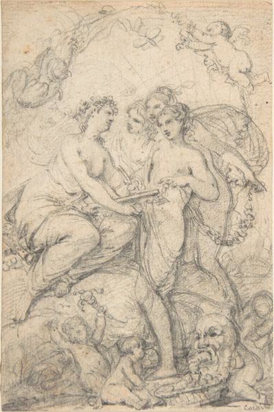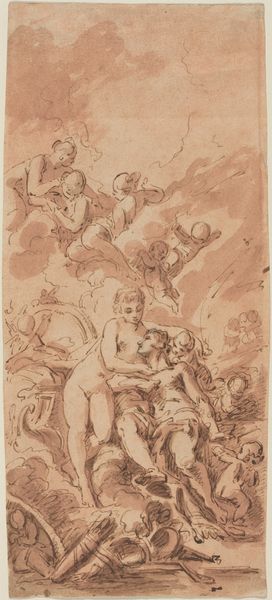 Curator: This drawing is titled "Angel Pietà in Clouds", attributed to Palma il Giovane, rendered in ink on paper. It currently resides in the Städel Museum's collection. Editor: My initial impression is one of dynamic fragility. The stark contrast between the heavy, drooping figure of Christ and the delicate, swirling cloudscape is really striking. The ink medium gives it an immediate, urgent feel. Curator: It's compelling how Palma uses such humble materials – just ink and paper – to depict such a grandiose subject: the Pietà, re-imagined with angels. The rapid, sketch-like quality suggests this might be a study or preparatory work. Do you think that context affects its reception? Editor: Absolutely. Knowing it’s a study reframes it. We start to consider the artistic process – Palma’s exploration of form and emotion rather than solely a devotional object for display or patronage. It becomes about the *making* as much as the *meaning.* What were the contemporary cultural factors impacting the image? Curator: The Renaissance, especially in Venice where Palma worked, saw a rise in humanist thought. The image then speaks to the individual’s relationship with the divine, made manifest through Christ's suffering and the consoling presence of angels. Moreover, Venetian art, informed by interactions between local artistic traditions, patronage structures, and the booming trade networks, created high demand for works portraying religious narrative. Editor: And the distribution of prints at the time must have spread such imagery widely, influencing the popular imagination... You've highlighted for me how such accessible materials could still play a crucial role in distributing these heavily institutional messages of power at the time. I feel as though, although sketchlike in appearance, it is speaking volumes through accessible media and technique. Curator: Exactly. A poignant reflection on the intersection of faith, production, and the human condition, conveyed so skillfully by Palma. Editor: Indeed, Palma is inviting us into the workshop alongside him as much as asking us to simply observe finished piety.