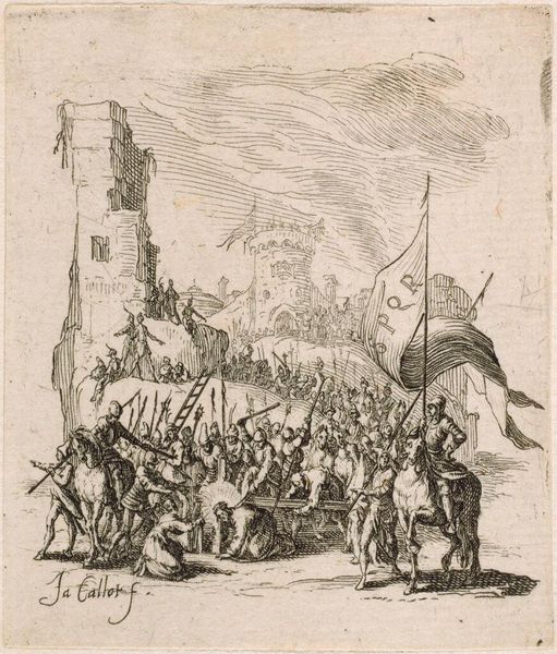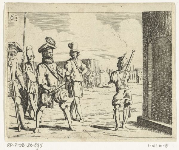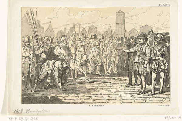 This engraving shows Gijsbrecht van Amstel and Herman van Woerden being led into Utrecht as prisoners in 1252, though we don't know exactly when it was made, or by whom. Engraving is an intaglio process, which means the image is cut into a metal plate, traditionally copper. Ink is then applied to the entire plate, and then wiped off the surface, leaving ink only in the incised lines. The plate is then pressed onto paper, transferring the ink and creating the print. Look closely, and you'll see how the artist has used lines of varying thickness and density to create a sense of depth and shadow. The precision of the engraved line allows for intricate detail, capturing the expressions on the prisoners' faces and the texture of their clothing. Engraving was a highly skilled and laborious process, requiring years of training. The resulting prints were often reproduced and distributed widely, making images accessible to a broad audience. This print, therefore, reflects not only the depicted historical event but also the social and economic context of its production, where skilled labor and reproducible media played a crucial role in disseminating information and shaping public opinion.