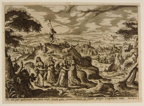 Curator: This engraving, titled "Vision of Ezekiel," was created by Nicolaes de Bruyn, who lived from 1571 to 1656. I am immediately drawn to the stark contrast between the figures and the landscape. Editor: The process of engraving itself, incising those lines into the metal, dictates the kind of detail and starkness we see. The material constraints shaped De Bruyn's choices. Curator: The scene depicts a biblical prophecy where Ezekiel revives dry bones—a theme ripe with socio-political meaning. This plate would have circulated within a specific cultural milieu. Editor: Indeed. The very act of printing and distributing such imagery highlights the developing infrastructure of art production and consumption in the late 16th century. Look how efficiently an idea could be mass produced. Curator: Considering the context, this piece speaks to the enduring power of belief. I appreciate your insights into its material circumstances. Editor: And I, yours, into its cultural resonance. It reveals so much about how meaning is manufactured, distributed, and received.