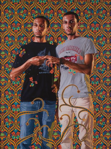 Kehinde Wiley made this painting, Abed Al Ashe And Chaled El Awari, using oil on canvas to bring together the everyday and the extraordinary. The tight rendering of skin tones and clothing contrasts with the flat, decorative background, and I just love how Wiley fearlessly mixes it all up. Check out the patterned background; it's like wallpaper on steroids. Then, those floral embellishments crawling over their shorts, like vines claiming new territory. It's this tension that grabs me—the real versus the staged, the personal versus the historical. Wiley is in conversation with artists like Van Dyke or Titian, those old masters who painted portraits of power and privilege. He flips the script by placing young, contemporary men of color in these traditionally formal poses. He is reimagining who gets to be seen, valued, and immortalized on canvas. It's about visibility, representation, and owning art history.