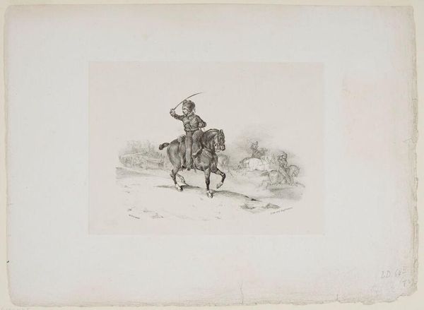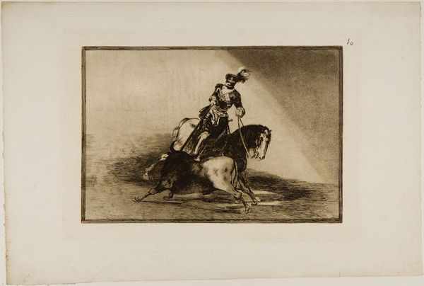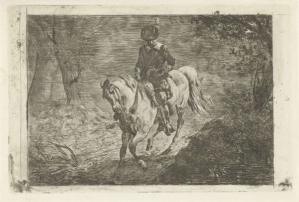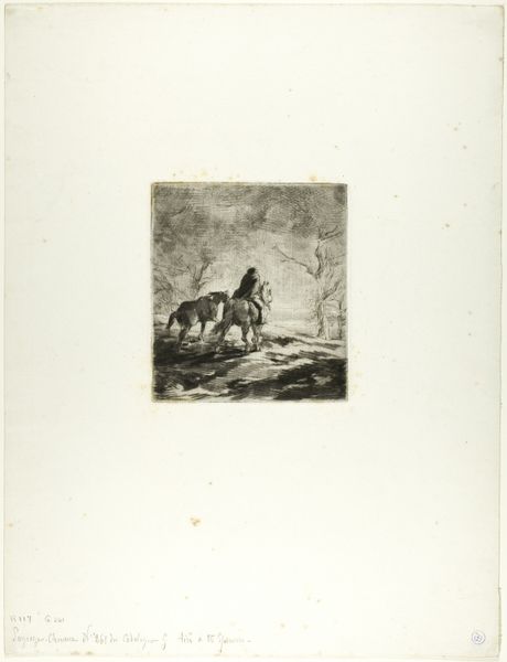 Editor: This is Eugène Delacroix's "Steenie, or Redgauntlet, Pursued By a Sprite." It's a dynamic image of figures on horseback. What’s particularly interesting to you about the printmaking process here? Curator: The etching medium is crucial. It democratized image production, enabling mass distribution. Consider how this reproductive technology spread Romantic ideas about folklore and the supernatural to a wider audience. Editor: So, the *means* of making it influenced its reach? Curator: Exactly. The accessibility of prints like these shaped the consumption of art and narrative in 19th-century society, challenging traditional notions of artistic value tied to unique, handcrafted objects. What do you make of the composition itself? Editor: I see. Thanks, that gives me a lot to think about.