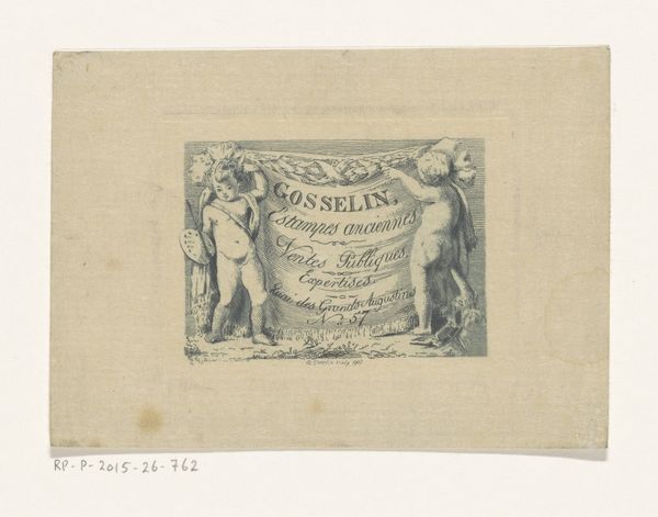 Curator: This is a trade card for J. Dallinger, an engraver and copper plate printer operating sometime between 1800 and 1900. It's an etching and engraving. The card, boasting their services, is held at The Met in New York. Editor: My initial reaction is pure craft. The delicacy, the precision... I imagine Dallinger poring over these plates. It feels a world away from our screen-printed, mass-produced everything. Curator: The whole card is just layers of labour, isn't it? Even the cherubs at the top, busily engaging in different stages of graphic reproduction. The etching suggests printmaking is child's play. Editor: It's genius. Marketing and social commentary intertwined. Look how the image on the trade card subtly positions hand production as something touched by cherubs or even fairies. But behind every magical engraving, there is a work process. It’s calling my attention to the making of the printed ephemera as its focus. Curator: And look at the bottom half of the image—the little vignette of Norwich, a boat drifting down the river. There is so much local pride distilled in these compact details. Editor: The composition frames the river as an element intimately bound up in the process. I love seeing a river connected to production in early capitalist representations, highlighting an essential role in both infrastructure and economy. Also, notice that J. Dallinger specifies "Printing in Gold & Colors". In a trade like printing, skilled craftspeople could make a living through material manipulation in innovative processes. Curator: True. Even today, those shimmering details command a certain… je ne sais quoi! Though its utilitarian purpose feels rather quaint in this digital era, doesn’t it? Still, I'd commission something as gorgeous, forget business cards, lets just declare I want my grocery list made with this level of dedication to craft! Editor: Indeed. We often separate the so-called “fine art” from functional printing like this. This trade card wonderfully dissolves those artificial barriers. A reminder that all art, in the end, emerges from skilled work performed by real people.