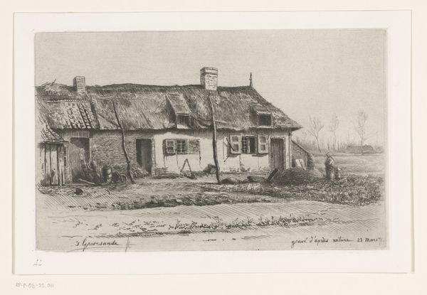 Curator: This etching from 1866 by Charles Jacque, titled "Landelijk huis met schapen en zittende figuren," presents a bucolic rural scene. What are your initial thoughts? Editor: There's a melancholic stillness about it, despite the presence of figures and livestock. The muted tones amplify the solitude, I think. The heavy, thatched roof of the farmhouse seems to visually weigh the scene down, anchoring it to the earth. Curator: Absolutely. Consider Jacque's mastery of line and tone here. Notice how he employs etching to create a delicate interplay of light and shadow, achieving remarkable textural detail in the thatch and foliage. This adds depth. Semiotically, these elements are coded as representations of simplicity. Editor: From a material perspective, it's intriguing. Etching, with its reliance on acid to bite into the metal plate, is a process that reflects both control and chance. The print is labor-intensive, revealing a slower mode of image-making. This challenges the idea of the artist as purely intellectual. Curator: Interesting point. The composition adheres to classical landscape principles, guiding the eye through the planes of depth. This calculated arrangement invites contemplation of nature's order and harmony—the aesthetic equivalent to the Romantic movement's yearning for connection with the pastoral, perhaps. Editor: However, the print’s likely affordability suggests broader consumption within a burgeoning middle class hungry for imagery romanticizing rural life while simultaneously detached from its labor realities. The subject matter thus embodies class assumptions of labor relations. Curator: That friction elevates the work, complicating it beyond mere representation. The muted palette—those pale grays and blacks—also influences the emotive impact of the scene. I am drawn to the artist's skill with value contrast; he subtly leads you into an era, creating its unique feel through tonality. Editor: Yes. Examining Jacque’s choice to reproduce it on paper, though, a somewhat democratized medium in comparison to a painting, we observe a decision potentially impacting access, cost, and even intended audience. His process shapes accessibility, altering social perception as paper is inherently mobile. Curator: By interweaving structure and materials, it unveils a nuanced vision of landscape, revealing so much depth! Editor: I agree—considering materials exposes not just the 'what' but profoundly, 'how' the era felt the landscape around it, impacting not only Charles Jacque, but us as well!