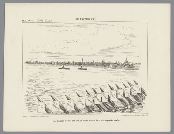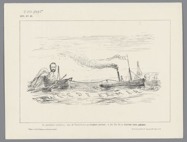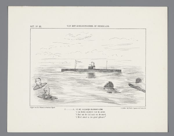Curator: It's captivating how a simple etching can deliver such a punch. Looking at Johan Michaël Schmidt Crans's "Spotprent" from 1878, the initial impression is undeniably unsettling. It’s chaos in monochromatic form! Editor: Yes, the artist's satirical take is quite stark. What do you see within its formal qualities? Curator: First, there's the dynamism captured through stark contrast. A frenzied group appears to be fleeing, perhaps from danger, certainly in distress. Note the meticulous hatching that gives texture to the water and imbues the scene with nervous energy. And the monstrous crocodile seems ready to… devour "HET RECES DER TWEEDE KAMER," which translates from Dutch to the recess of the Second Chamber. It’s labeled right there on its back. The balance of frantic energy on one side, and looming menace on the other, creates undeniable tension. Editor: And I love how the landscape sort of blends a swampy sort of death wish with high political tension! Its very dark humor relies on that central monster: the budget! Can you explain more about this political theme, though? Curator: Well, historically, in 1878, this probably satirized a budget debate or a government policy decision. Etchings like these provided a visual critique, reaching a wide audience through newspapers or journals. The crocodile is not just a reptile; it embodies something more insidious, feeding off government structures. Editor: Quite. The almost amateurish depiction and direct subject of "budget debates," in essence, are what is absolutely masterful here: Crans somehow shows how these ideas and issues that most people snooze through are truly matters of life and death! It feels very current, despite its history, wouldn’t you say? Curator: I couldn't agree more. By reducing political issues to stark, almost primitive symbols, Crans invites everyone to see the inherent drama. Editor: A perfect blend of style and scathing sociopolitical narrative. "Spotprent" indeed leaves a lasting mark. Curator: Yes, a powerful intersection between form, critique, and perhaps a timeless reflection of public perception of power.