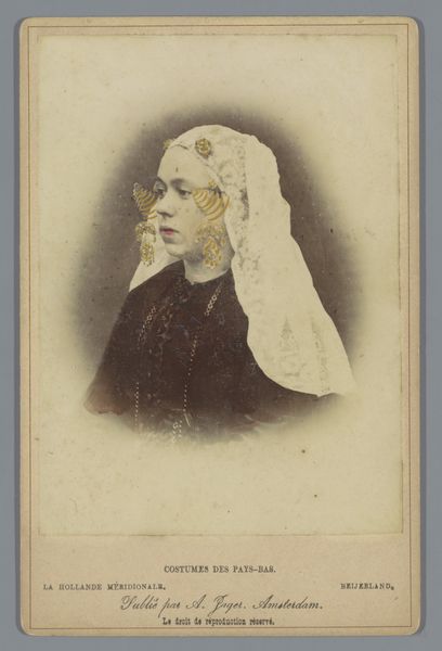 Idanus Hendrikus Slaterus made this small portrait of an unknown woman in Friesian traditional dress in the late 19th century. The photograph is composed with a strong emphasis on verticality and symmetry, elements that contribute to its formal and somewhat rigid structure. The oval frame around the woman's figure isolates her, emphasizing her face and attire. The stark contrast between the dark clothing and the pale background flattens the image, reducing depth and focusing attention on the surface details. Note how the elaborate lacework of her cap and the intricate patterns on her dress are rendered with striking clarity. These details serve not only to document the attire but also to highlight the cultural codes embedded within the clothing itself, acting as signs of identity and status. Consider how this portrait challenges traditional notions of representation by presenting an anonymous subject with such meticulous attention to detail. It invites us to consider how photography, as a medium, can both preserve and obscure identity.