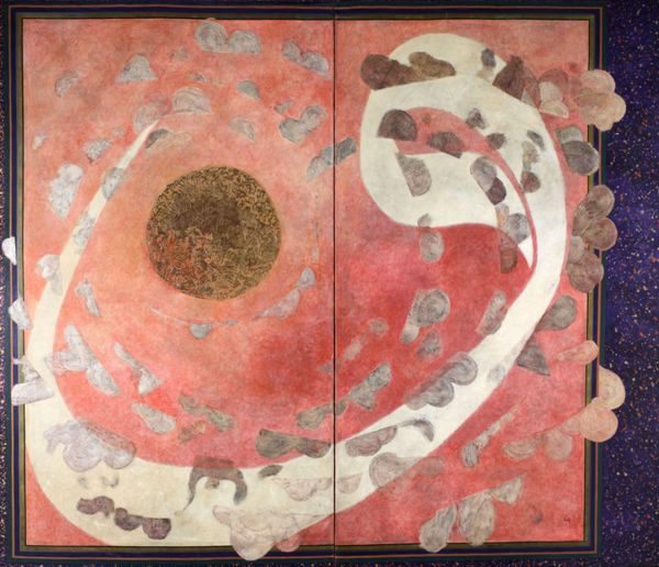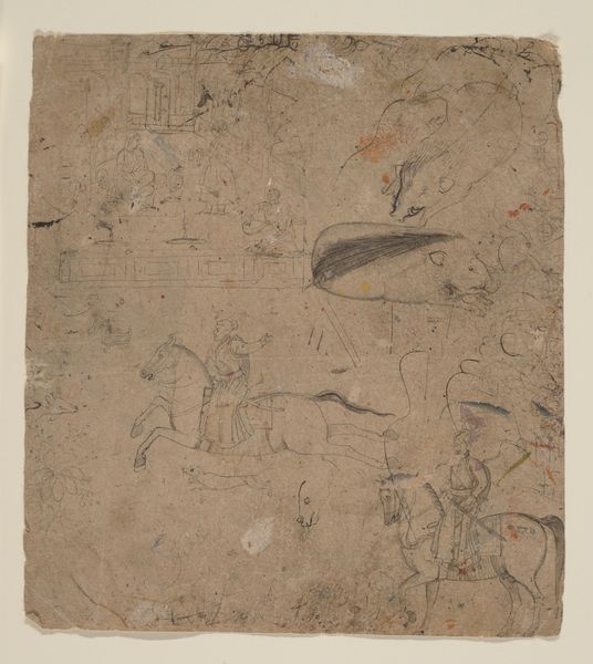 Editor: So this is "Painted Fan with a Design of Feathers and Three Medallions" by Charles Conder, made sometime between 1893 and 1909. It seems to be watercolor and colored pencil on paper. I'm immediately struck by the delicate balance between the defined shape of the fan and the free-flowing, almost ethereal quality of the design. What stands out to you from a more formal perspective? Curator: The most compelling aspect lies in the interplay of contrasting elements. Consider the rigid geometry of the fan itself – the sharp lines of its frame – set against the organic, swirling motifs of feathers and floral patterns rendered in soft watercolor washes. This juxtaposition creates a visual tension. Editor: It almost feels like the medallions are interrupting the pattern. Is that intentional? Curator: Indeed. These meticulously framed figural miniatures disrupt the surface, introducing an element of focused representation amidst the more abstract, decorative expanse. Note also the rhythmic repetition of these oval frames, each echoing the curvature of the fan’s edge. This repetition structures the design, creating a formal unity despite the seeming disjunction of representational modes. How does this repetition affect your perception? Editor: I see it. The way those miniature scenes punctuate the feathery design almost creates a staccato effect, drawing my eye across the surface. Curator: Precisely. Conder masterfully controls the viewer’s gaze through this carefully orchestrated composition. It moves beyond mere decoration, prompting an examination of form and the dynamics of visual engagement. Editor: I hadn't considered that before! Now I see how the entire structure reinforces its function as both object and art. Curator: By analysing elements such as line, shape, composition, and the strategic placement of representational imagery, a more thorough awareness develops that deepens appreciation. Editor: Thanks! Looking at this piece through a formalist lens really brings to light nuances I hadn't appreciated before.