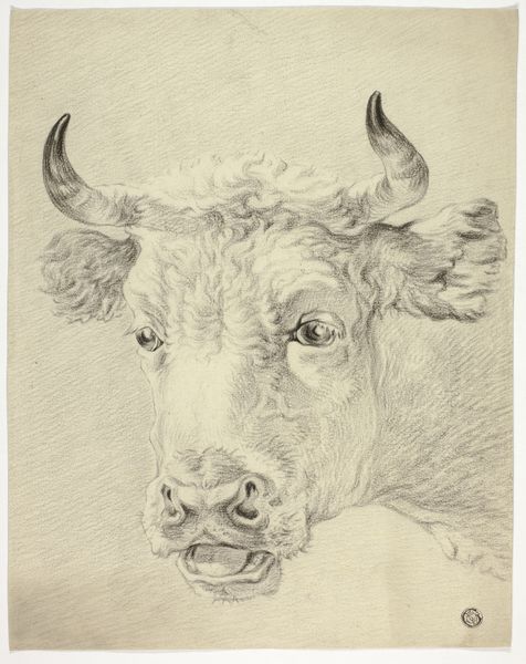 Curator: Before us, we have "Head of a Cow," a drawing created by Pieter Gerardus van Os between 1786 and 1839. The medium here is quite simple – pencil on paper. Editor: The simplicity works. There's something immediately striking about the intense detail he achieves. The layering of pencil strokes creates a very tangible texture. You can almost feel the rough hair of the cow. Curator: Precisely. The artist’s skill lies in conveying form and volume through subtle variations in tone and line density. We need to look at it beyond being a simple 'animal portrait.' It tells us a great deal about the artistic production of animal imagery at the time. Animals became objects of study. Editor: From a purely formal perspective, I'm fascinated by how he captures the light. Notice how the artist uses hatching to model the form, with denser marks indicating areas in shadow and lighter, more spaced-out strokes suggesting highlights. Curator: It raises questions about agrarian life and the rising importance of livestock during that period. Did van Os engage with new approaches to breeding? To agriculture? Editor: Possibly. However, the composition, placing the cow's head front and center, isolated against the blank paper, emphasizes its sculptural qualities. He clearly understood the structure of the animal’s skull, capturing the nuances of its musculature and bone structure with careful precision. Curator: Van Os likely was commissioned for this. This kind of close observation served emerging scientific understanding, commodifying animal subjects for an increasingly commercial market. How does his depiction reinforce the socio-economic status that relied upon them? Editor: While that is one way to view the function, and possibly patronage of the artwork, I come back to form. The texture and form speak of weight and solidness – this wasn't just sketching, this was observation using form itself. Curator: I agree that the piece captures both its material essence, but that essence doesn’t come from nowhere – the context that formed both its creation, and its present exhibition tells its own story. Editor: Perhaps the dialogue between pure aesthetics and that cultural construction, that makes this unassuming little drawing so fascinating. Curator: Indeed. Thank you.