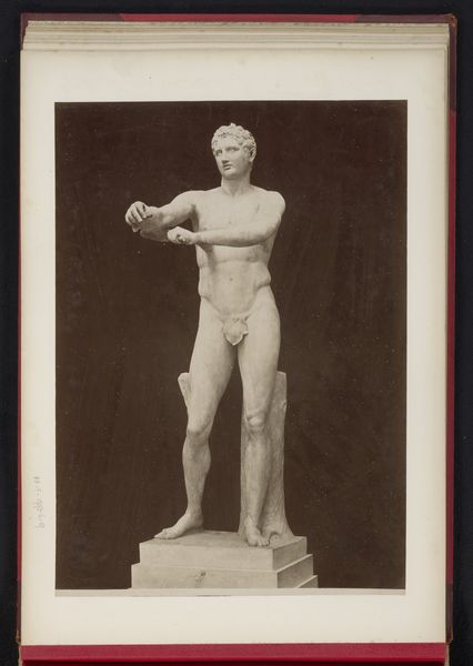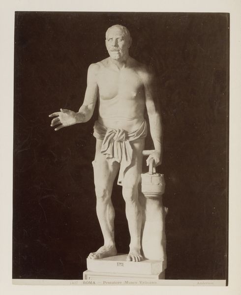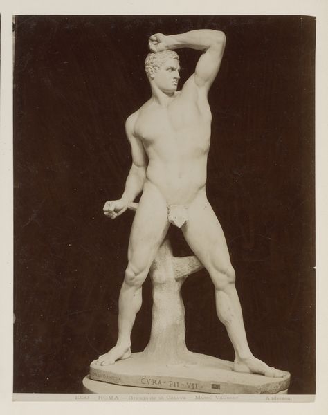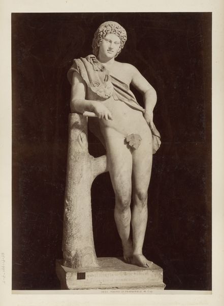 Editor: Here we have "Sculpture of Damoxenos, Vatican," made between 1857 and 1875. It’s currently held at the Rijksmuseum and seems to be crafted from marble. It depicts a nude male figure, classically rendered, but also feels… staged. How do you interpret this work, especially considering its historical context? Curator: The marble itself is a key point. Think about the quarrying, the labor involved in extracting and transporting that stone, then shaping it. The artist, James Anderson, through his photography, isn't just presenting a classical ideal. He's participating in a larger industry that commodifies and circulates these images. This circulation reinforces certain notions about beauty, masculinity, and power, doesn't it? Editor: So it's not just about the ideal form, but about the process that creates and disseminates that ideal? The labor behind the photograph is often invisible. Curator: Exactly. Consider the staging, the props - even the "classical" tree trunk provides support. What's supporting what, physically and metaphorically? And how does this image become a product itself, available for consumption and replication? It makes you question, doesn’t it, the very idea of a singular, 'original' artwork. Editor: I never really thought of the circulation of images that way, as reinforcing specific ideas. It opens a new perspective on the social role and responsibility of photography in museums. Thank you! Curator: Indeed. Considering these processes behind the artwork makes one see how art becomes implicated in power structures. It's something to consider further!