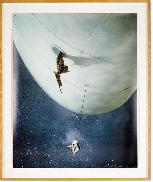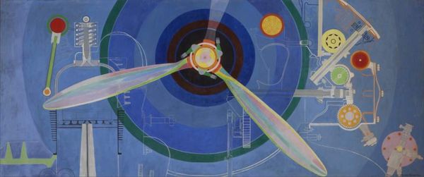 Stanley Pinker’s “Into Orbit” is an oil on canvas work that plunges us into a mesmerizing, cosmological tableau. Dominated by a large, concentric form in shades of yellow and white, the painting evokes a sense of celestial mechanics. Note how this central structure, reminiscent of planetary orbits, immediately captures our attention. Pinker employs a restricted palette, yet there's a dynamic interplay between the warm yellows and the cool blues of the background. These colours contribute to a sensation of movement and depth. The small, whimsical figures hint at human aspiration within the vastness of space. Consider how Pinker disrupts traditional perspective, presenting a flattened, diagrammatic view. The stars scattered across the canvas create a semiotic system, a coded language inviting us to decode their arrangement and meaning. "Into Orbit" destabilizes our conventional understanding of space, inviting us to consider the painting as a site for exploring new perspectives on our place in the cosmos.