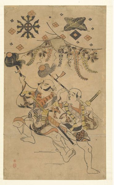 Editor: This is a print by Torii Kiyotomo from 1723, housed at the Art Institute of Chicago. It depicts the actor Ichikawa Danjuro II. The bold lines and flat planes of color create a really striking effect. What draws your eye when you look at this? Curator: What I see here is a deliberate construction of identity, not just of the actor as a performer, but of the very societal roles he’s embodying. Notice the text surrounding him. It's not just decoration. These words frame and define him within specific narratives of the time. What roles were considered important? Editor: You mean the play that he’s in? Is the text excerpted from that? Curator: It's more than just the play, I think. The *ukiyo-e* tradition itself served as a commentary on the transient pleasures of the floating world. These prints democratized access to art and fame, immortalizing not emperors or gods, but actors, courtesans, and the urban lifestyle. He is literally covered and surrounded by these concepts. The clothing as performative. Even the pose with that script as him laying claim. Think of this actor, now, existing both inside and outside the narrative he's performing. Is he still playing a part outside of the play? Is he Soga no Goro? Editor: That makes me see the art differently. It's not just a portrait of a famous actor but an exploration of fame, identity, and representation in a specific time and place. I guess those prints helped shape not only the actors careers but also society's perception of them. Curator: Precisely. By engaging with the art through this lens, we uncover how representations impact identity construction and social dialogue. Understanding what we celebrate is powerful! Editor: That’s really helpful. Thank you! I’m excited to dig a bit deeper into *ukiyo-e* art and that cultural context now.