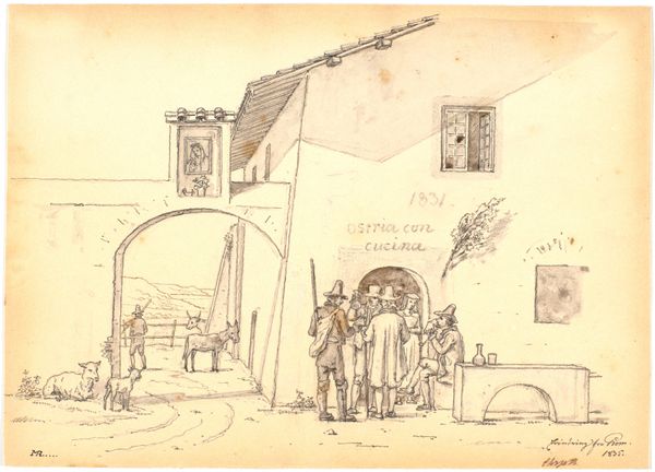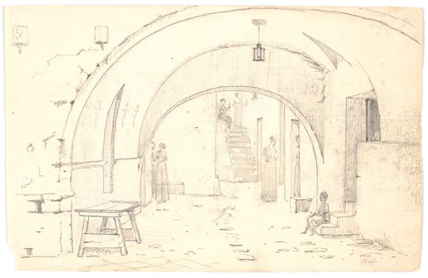 Editor: This is Louis Ducros's "Eetzaal van de herberg in Barletta," created in 1778 using ink. It’s currently housed at the Rijksmuseum. It feels…almost theatrical, like a stage set. What do you see in this piece? Curator: Immediately, I’m struck by the cultural memory embedded in this space. Consider the hearth – the symbolic center of the home, the place of warmth and sustenance. Ducros places it center stage, a literal and figurative representation of community gathering. Notice, though, that this is a public space, a social space of the inn, where identities mix and narratives entwine, diverging from a strictly domestic setting. What emotions does this hearth, these people gathered near it, evoke? Editor: It feels kind of…transient. The light is stark, and everyone looks like they're just passing through. It almost feels temporary, in a way that undercuts any strong feeling of "community." Curator: Excellent point! That transience resonates deeply. The open space of the inn symbolizes liminality, where guests pause between journeys. It’s where societal roles are fluid, shaped by chance encounters, short term. Notice how he uses line, tone and gesture to lead your eye to other transient symbols such as a window and doorway framing more travelers in the background. What are the potential implications of these travellers? Editor: Hmm, maybe it hints at the fragility of connection? All these journeys starting and ending, and relationships and encounters existing very much in that "in-between" space. Curator: Precisely. The inn then becomes a microcosm of life’s journey itself. It’s fleeting encounters and shared humanity cast together against a backdrop that reminds one of Romanticism. This symbol highlights cultural memory to create a narrative about transition. How do you find the artwork’s symbolism influences or changes the impact the space and setting had? Editor: Seeing it through the lens of those symbols definitely makes it less of just a simple snapshot of a place, and more about how fleeting those moments in that place actually are. Curator: Indeed. Ducros masterfully uses everyday scenes, embedding them with enduring, thought-provoking truths.