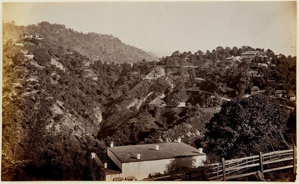 Curator: This is Samuel Bourne's "Darjeeling, from the Grounds of Beechwood Park, Looking North." I love how the details sort of swim in the distance. Editor: It feels like a history lesson, but one viewed through sepia-toned glasses. I mean, consider the colonial gaze here. Curator: Yes, there's a definite power dynamic, yet the scene itself has a quiet intimacy. The way he captures the light filtering through those trees... Editor: Absolutely, but we can't ignore the broader context. What was life like for the people who lived there, under British rule? What stories are missing from this frame? Curator: It's a romanticized vision, no doubt. Maybe Bourne saw beauty, but we must acknowledge the structures that made such beauty possible. It is a window, albeit a distorted one. Editor: Indeed. The act of seeing itself carries so much weight. Curator: It's a reminder to look beyond the surface, to question the narratives that are presented to us. Editor: Exactly. Let us always remember what lies outside the frame.