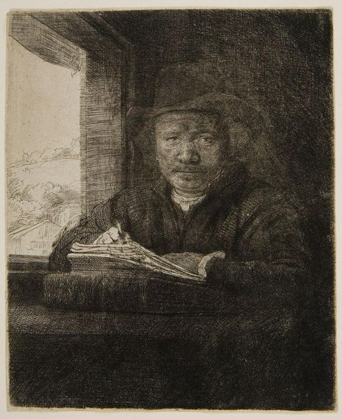 Curator: This etching, “Rembrandt Drawing at a Window,” was created around 1648 by Rembrandt van Rijn, and is currently held at the Minneapolis Institute of Art. Editor: My first thought? He looks so intensely…ordinary! Not in a bad way. Just human. There’s a lovely plainness about the guy—makes you want to lean in and hear his story, you know? Curator: That 'plainness,' as you call it, is exactly what Rembrandt was after, wouldn't you agree? Etchings, particularly those rendered with drypoint like this one, allow for incredibly fine detail. The resulting image reveals not just an outer likeness, but what seems to be an inner state, exposed through subtle shading and light. Editor: Totally. It’s the kind of 'unflattering' portrait only a true artist can pull off! His gaze feels open, direct...but slightly wary, too. There's a gentle weight in his eyes, a hint of melancholy. I'm guessing that image—drawing at the window, pondering, sketching his feelings onto the page—taps into that eternal creative struggle. Curator: The window itself holds symbolic resonance. Traditionally, the window represents a boundary—between the internal world of thought and feeling, and the external world of action. Here, it becomes the border between introspection and expression, captured by the quill in his hand and the open pages before him. He uses the outside as his source. The outside world is needed to see one's self. Editor: And there’s that beautiful use of chiaroscuro. He’s literally in-between light and shadow! The dark areas framing his face really do throw that pensiveness into sharp relief. All this talk is making me want to pick up a pen. Curator: It seems Rembrandt hoped to convey how essential artistic creation truly is to one's core humanity—allowing one to express, reflect, and maybe even come to terms with oneself in this fleeting experience of life. Editor: Art as a tool of understanding? That tracks. This etching has definitely made me feel less alone with my own struggles today.