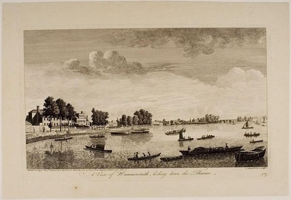 Editor: So this ink drawing on paper is entitled “Gezicht op Broek in Waterland,” placing it somewhere between 1800 and 1850. It seems to capture a still, serene landscape. What immediately strikes me is the attention to detail, particularly in the reflection on the water. How do you interpret this work, looking at it formally? Curator: Primarily, I am drawn to the composition. The artist’s careful placement of the horizon line creates a balanced interplay between the sky, water, and land. Notice how the cloud formations echo the town's architecture below. What effect does this mirroring create? Editor: It gives the artwork a sense of unity and perhaps even harmony. The softness of the ink adds to the tranquil mood. Curator: Precisely. Observe how the artist employs a limited tonal range, almost monochromatic, to convey depth and atmosphere. Semiotically, this reduced palette amplifies the quietness of the scene. Consider also the meticulous rendering of architectural forms and the sail boat against the diffused background. Do you see any possible tensions at play in the drawing's construction? Editor: I see that. While the scene itself seems tranquil, the precision of the architectural rendering contrasts with the almost blurred depiction of the background elements. Is this a commentary on nature versus urbanity? Curator: Potentially, although it may just highlight how the artist chooses to portray certain aspects. The composition draws the viewer's eye to the village, even though the sky and water occupy a large proportion of the overall image. Considering the principles of realism, the lines are precise to their architectural and natural elements, with minimal emotionalism; though elements of Romanticism prevail, specifically in the grand scope of the setting and softened affect. Editor: It's amazing to consider how all of those compositional choices result in such a captivating scene. I'll never see it the same way again! Curator: Indeed, scrutinizing the composition can open doors to new perceptions of the work, allowing a broader aesthetic enjoyment.