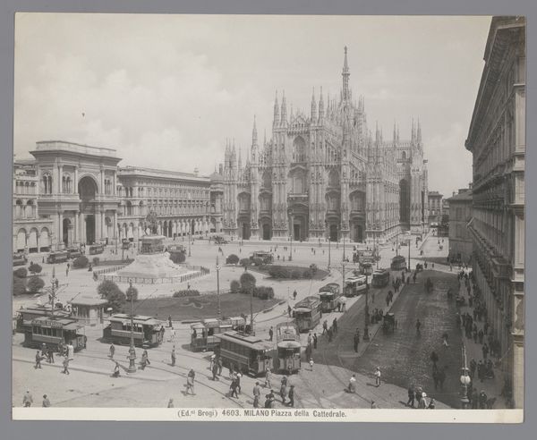 Editor: This photographic print, “De Dom te Milaan,” by Giacomo Brogi, dating back to 1895, has this rather serene, almost ethereal quality despite depicting such a grand architectural structure. What do you see in this photograph? Curator: It’s the sort of photograph that whispers secrets, don’t you think? Beyond the factual representation of Milan’s Duomo, there's this almost melancholic stillness. I imagine Brogi setting up his camera, the hush before the click, capturing not just stone and spires, but also the very spirit of the place, a crossroads of history and human aspiration. Almost feels like staring at a very elaborate sandcastle, doesn’t it? Intricate and ultimately, ephemeral. How do you think the subdued tones add to the story? Editor: They definitely make it feel…timeless? Like this could be from any era, a cathedral perpetually under construction in our minds. But it is just a facade with little activity in the square. Does that mean anything to you? Curator: Absolutely! Look how the Duomo dominates the frame! All of those pinnacles reaching skyward. It's ambition cast in marble! Think about the period. Italy, newly unified, trying to define itself. What better symbol than this awe-inspiring cathedral, a testament to human ingenuity and collective faith? I love that he seems to pose it against the stark backdrop; an almost aggressive claim on modernity. A real estate power move, really. Editor: So, it's not just a pretty picture, it is more of a statement. I see the picture anew, I missed that. Curator: Precisely! That's the joy of art, isn't it? Peeling back the layers to reveal the ideas beneath. Thanks for taking this walk with me today. Editor: Thanks to you. Now, if you'll excuse me, I have a term paper to write about architectural sandcastles.