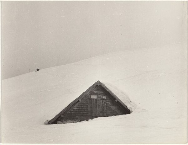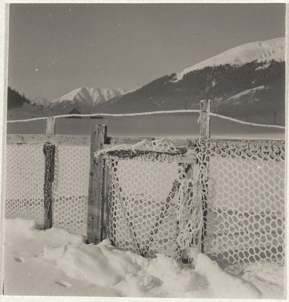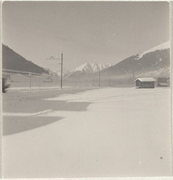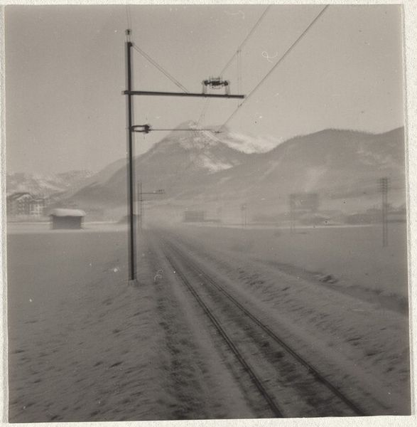 Curator: The stark expanse of snow filling the foreground immediately suggests isolation and silence. Editor: Indeed. We’re looking at a black and white photograph titled “Power lines--Landscape”, dating roughly from 1941 to 1945, credited to Robert Frank. What strikes me is the contrast: the immensity of the mountain set against those almost frail looking power lines cutting across the top of the frame. Curator: The power lines introduce an element of the modern world juxtaposed against nature's grandeur, a common visual theme that symbolizes human advancement and its connection—or perhaps disconnection—with the natural world. The visual contrast, however, also emphasizes a human mark across this wild landscape, literally bringing electricity and modernity. Editor: Precisely! Post-war Europe witnessed this juxtaposition constantly. Reconstruction efforts often meant integrating modern infrastructure into landscapes scarred by conflict. I imagine this photo captures that very tension of needing progress while confronting recent trauma. It's hard not to consider the potential political weight. This photograph doesn’t exist in a bubble. Curator: Symbolically, even the snow is multivalent. It's a symbol of purity, of a fresh start. Yet, its overwhelming presence here could represent the entombment of the past, perhaps even suppressed memories during that time. Does this place hold an implicit reference to something obscured from plain sight? What would a native to this area see in this view that we visitors do not? Editor: Those are critical questions. By emphasizing the mundane—power lines—Frank subtly reveals a larger, often overlooked, transformation occurring in everyday life after the war. It is not heroic subjects, it is what remains afterward. Curator: And these quiet images open our gaze onto these unsung transformations. Robert Frank truly makes us see how things change after a monumental event. Editor: Absolutely. He gives a record of society—even if a frozen one. We see beyond just what's in front of us—I appreciate how he reframes ordinary existence.