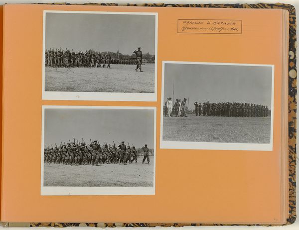 This photo album page, titled 'Ceremonie Duitse Wehrmacht,' from an anonymous maker, captures a formal moment with sharp monochrome contrasts. The way these images are presented, collected together, suggests an art-making process of assemblage and collation. The physicality of this object is important: each small, crisp photograph is carefully mounted on a heavy grey page. This creates a layered effect that encourages close looking. The serrated edges of each print give the images a tactile quality, contrasting with the sombre subject matter. The stark contrast of the black and white emphasizes the regimented lines of the soldiers, making each figure seem both individual and part of a larger, imposing structure. Looking at the way these photographs are grouped, their placement and juxtaposition, the work reminds me a little bit of Gerhard Richter’s photo paintings, where the act of reproduction and re-presentation alters our perception of history and truth. Like Richter, this album page challenges us to question the nature of image-making and its power to shape our understanding of the world. Ultimately, it's a powerful, if unsettling, piece.