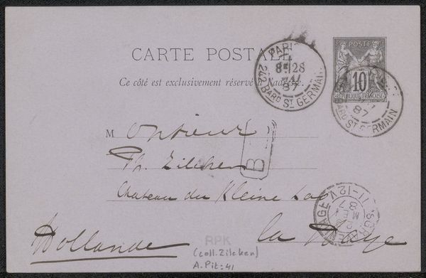 This is the back of a postcard to Philip Zilcken, originating from France. The stamp in the upper right is particularly revealing. We see two figures intertwined in what seems to be a classical embrace. This motif, resonant with images of Eros and Psyche from antiquity, speaks of transcendent love and connection, but here, stamped and delivered through the mundane postal system. The scene reminds me of similar couplings in Renaissance paintings, where classical ideals were revived, but always with a new, contemporary inflection. The stamp, a humble object, becomes a vessel carrying potent symbols of unity and affection across distance. The act of sending a postcard itself becomes imbued with this deeper emotional charge, engaging both sender and receiver in a dance of subconscious communication. The echoes of ancient gestures are passed down through time, altered yet persistent.