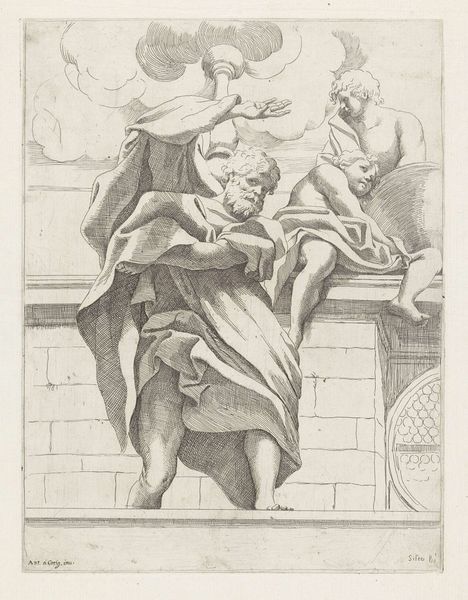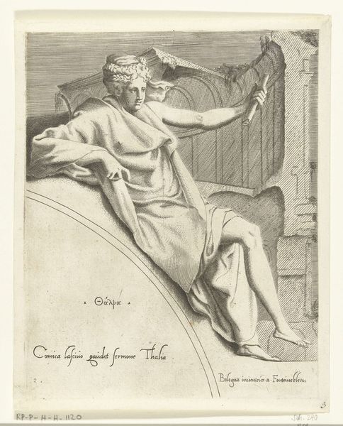 This engraving titled "Athena" is by an anonymous artist. We are invited to consider the layered meanings embedded in the representation of this classical goddess. Athena, often seen as a symbol of wisdom and strategic warfare, sits here draped in fabric. The cold, stark lines of the engraving, render her in a way that reflects the historical context of objectification and idealized femininity. She's seated atop a globe, perhaps alluding to the dominance and reach of knowledge and power, but there is also a vulnerability in the exposure of her body that complicates a straightforward reading of power. The gaze that the artist has given to Athena may invite us to reflect on how the objectification of women in art is related to broader socio-political structures. It challenges us to reflect on how women were, and continue to be, represented within society.
