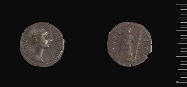 Curator: Here we have a Denarius of Lucius Verus, a Roman coin held by the Harvard Art Museums. Editor: It's remarkable how well the portrait has held up! The high relief and crisp lines still give it such a sense of gravitas. Curator: Indeed. Coins like these were not just currency; they were potent symbols of imperial power, circulating the emperor's image throughout the realm. Lucius Verus's likeness, replicated countless times, projected his authority. Editor: The profile on the obverse is meticulously rendered, isn't it? Note the detail of his beard, the laurel wreath... a carefully constructed image designed to convey power. Curator: And the figure on the reverse, likely a deity, reinforces that message, linking Verus to the divine and to enduring Roman values. Every image tells a story. Editor: I agree. It's fascinating how much visual weight such a small object can carry. Curator: A lasting testament to both Roman artistry and their sophisticated understanding of propaganda. Editor: A tangible piece of history that prompts reflection about power and representation.