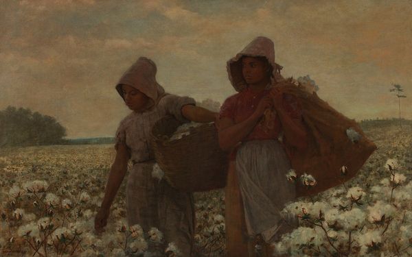 Curator: Jules Breton created this oil study, titled "Two young woman picking grapes (Study for \u201eThe vintage at Château Lagrange\u201c)," in 1862, here in the Joslyn Art Museum. It precedes his larger work. Editor: My first impression is of a rather somber, yet intimate moment. The color palette is restrained, dominated by earth tones. The weight these women carry isn't just the baskets; there's something in their gaze. Curator: Yes, Breton, known for his representations of rural life, often portrayed peasant women with a sense of dignity rather than romanticizing them, which was quite typical at that time. This painting allows us to consider how those laboring in vineyards experienced their lives in the 19th century. Editor: I wonder about the agency these women possessed. While Breton may avoid idealizing them, his gaze, inevitably male, and that of the presumed male viewers, colors our perceptions. Are they truly visible, or are we just seeing what the dominant culture projects onto them? The context of exploitation within agricultural labor has to be accounted for, and what the piece hides or reveals of the lived experiences of those women. Curator: Well, this was a study, a preliminary piece. Breton was likely capturing a specific moment, a certain light, or even the posture of the women. Consider this artwork as an aesthetic study as opposed to an explicitly sociopolitical narrative. Editor: Yet, even in its studied form, choices are made about representation. What details are highlighted, which are omitted? Even studies contribute to the broader narratives we construct around labor, gender, and class. How were such artworks initially exhibited and received? Understanding the mechanisms of display and critique during Breton’s time is essential. Curator: These images contributed to constructing ideas of Frenchness as it emerged during that century. Such paintings circulated among middle class viewers who likely were distant from such agrarian realities. Editor: Right, it begs us to question what stories get told and by whom. Breton offers us an image but, we must actively question whose reality it mirrors. I appreciate the painting's textures, even as it forces me to consider these power dynamics inherent in representation. Curator: It highlights, in a very concentrated form, the complexities behind representations of labour.