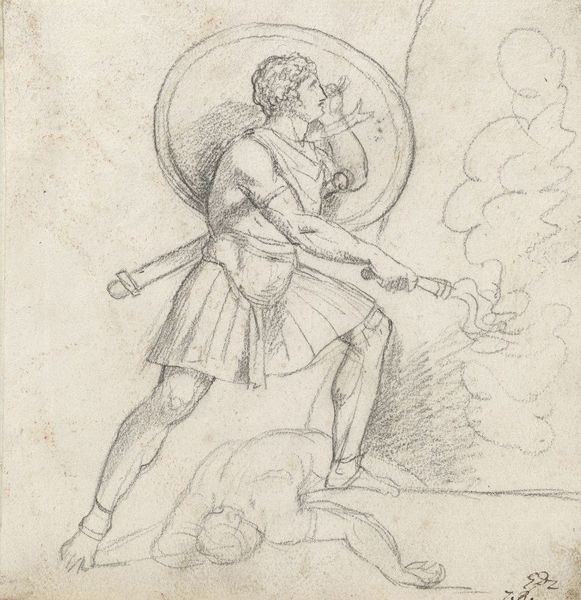 Domenico Fiasella created this drawing, "David Beheading Goliath", with pen and black ink over black chalk, heightened with white, on blue laid paper. Fiasella, a prominent painter in Genoa, Italy, lived in a time of strict social hierarchies and religious devotion. This sketch captures a pivotal moment of courage and defiance, illustrating David's triumph over Goliath. Yet, it also exposes the brutal act of beheading. The image exists in a complex intersection of power, faith, and violence; these themes are central to the story and the way it has been interpreted across centuries. The sketch's emotional intensity evokes a sense of awe and unease, inviting us to contemplate the complexities of heroism and the human capacity for both extraordinary bravery and violence. Does this depiction glorify David’s actions, or does it serve as a cautionary tale?