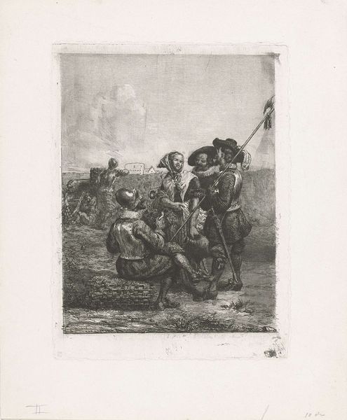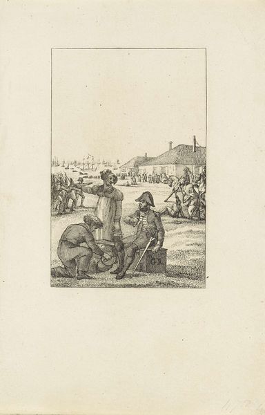 This etching, made around 1799 by Reinier Vinkeles, captures the departure of English and Russian troops, but it is the intimate scene in the foreground that intrigues us most. Observe the soldier seated upon a box, his gaze directed elsewhere, while a figure kneels to polish his boots. The act of polishing, of cleansing, is here imbued with the weight of defeat. It mirrors gestures seen across epochs, from religious purification rituals to the mundane chores of daily life. Yet, here, it carries a certain ambivalence. Consider how the simple act of cleaning has evolved—from ancient rituals of piety to modern acts of subservience or preparation for battle. The collective memory of these acts resonates within us, stirring emotions of humility, anticipation, and perhaps, a hidden hope for renewal amidst the debris of conflict. The gesture of polishing is a powerful evocation that binds us to the ebb and flow of history.