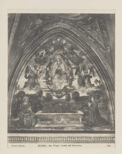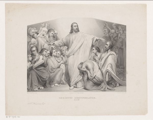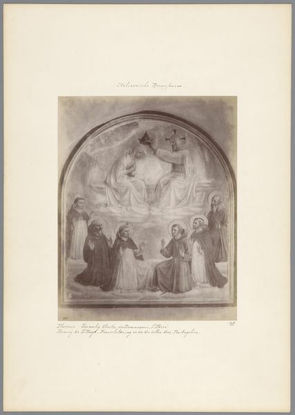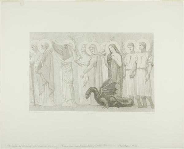 Editor: This is *Maleri i korrundingen i Skibby Kirke*, an etching and engraving by Julius Magnus-Petersen, sometime between 1834 and 1866. It feels like it's trying to capture a much older, medieval aesthetic. The figure in the middle—is it Christ?— seems both powerful and strangely flat. What do you see in this piece? Curator: What I see is an appropriation, and thus, a re-contextualization. Magnus-Petersen is engaging with Byzantine and medieval artistic traditions but filtered through a 19th-century lens. It’s vital to understand why a 19th-century artist would choose to emulate these earlier styles. This was a period of intense national romanticism, wasn’t it? How might a return to a "pure," arguably religious, artistic vocabulary serve the construction of a specific cultural or national identity? Editor: That’s interesting. I hadn’t thought about it as a conscious choice related to nationalism. The original murals must have been seen as inherently Danish in some way? Curator: Exactly! And not just Danish but inherently *Christian*, tapping into a long and powerful history of religious and political authority. Look at the deliberate archaism of the figures, the halos, and the stylized composition, and ask yourself what socio-political functions were enabled by this “return”. How do you feel this etching functions compared to the murals themselves? Editor: The print makes it reproducible and accessible to a wider audience. Almost like propaganda? Curator: Precisely. Art isn't created in a vacuum. We need to ask, what stories is this artwork telling about power, religion, and national identity in 19th-century Denmark, and what earlier narratives is it subtly reshaping, or even silencing? Editor: I guess I saw a religious image, but it's also about a specific moment in Denmark's history, trying to build an idea about the country. Curator: Yes, art is always connected to the culture that makes it. Hopefully you now view this artwork as more than simply a religious scene in an old style, but as a key cultural and political text as well.