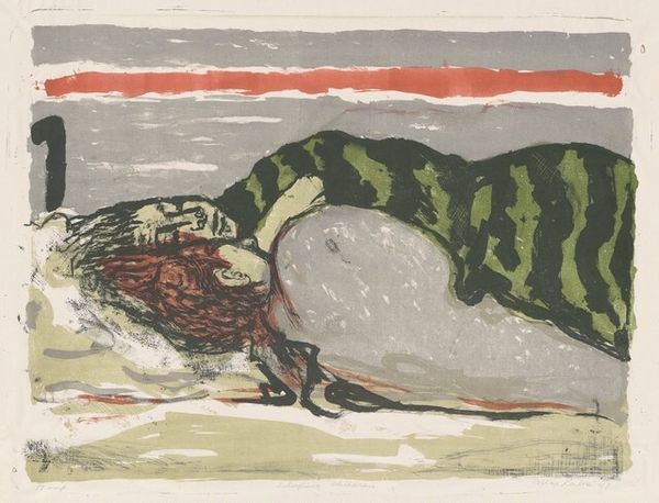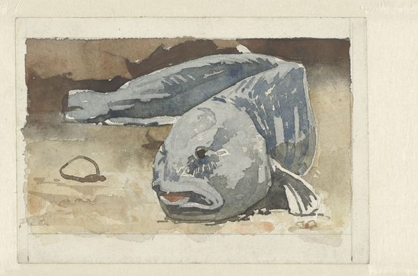 Curator: Here we have Willem Witsen’s 1883 watercolor drawing, "Side View of a Fish," currently housed in the Rijksmuseum. Editor: Well, it’s quite striking. I'm immediately drawn to the somber color palette, a very subdued range of blues and browns. The heavy use of watercolor lends a somewhat faded, melancholic mood to what should be a fairly unremarkable subject. Curator: Yes, Witsen often engaged with themes of mortality and the transient nature of life, reflecting the socio-political anxieties of the late 19th century. Fish, as a symbol, can be interpreted in various ways – representing everything from abundance and fertility to sacrifice and the inescapable cycle of life and death. The lone shell beside it underscores this sense of solitude and vulnerability. Editor: Absolutely. Structurally, the placement of the fish, almost pressed against the picture plane, removes any sense of dynamism, reinforcing that sense of stillness and decline. Note how the artist captures texture; the scales and the rough surface below are clearly visible with subtle value differences that do not draw a clear picture with bold dark lines. Curator: This work could be seen as part of a broader tradition of depicting animals, not simply as specimens, but as subjects embodying specific narratives about the human condition. One might even view it in light of emerging environmental consciousness at the time, given the rising concerns about pollution and the destruction of natural habitats. The dead animal is placed into art to allow contemplation. Editor: The very application of watercolour adds another dimension to its impact, doesn’t it? That fragile quality underscores impermanence of existence that ties the formal rendering, the colour, and even materiality all to this core interpretation. Curator: Indeed. By choosing such a fragile and fluid medium, Witsen seems to deliberately reinforce that theme. Looking at the "Side View of a Fish", understanding the historical currents intertwined in its making opens rich critical discussions for us even today. Editor: Ultimately, it is this visual experience, the immediate emotional resonance arising from his structural and chromatic choices, that lingers.