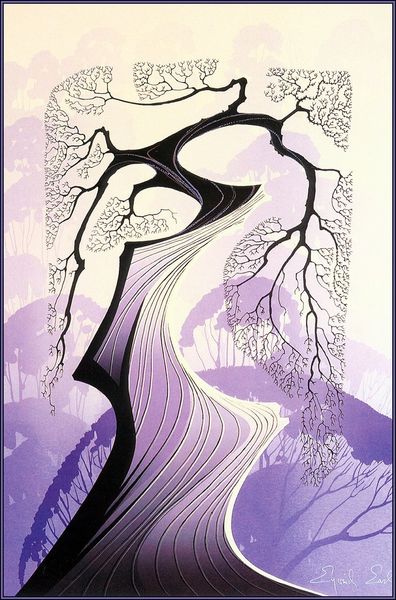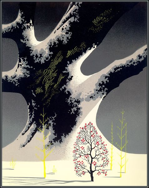 Editor: Here we have Eyvind Earle's "Winter Bonsai" from 1982, an acrylic painting. I'm struck by how the stylized tree seems both delicate and monumental against the icy blues. What do you see in this piece? Curator: This image makes me think about our relationship with nature, and how cultural lenses impact that. The 'bonsai' aspect is fascinating – the art of cultivating miniature trees, a tradition steeped in Japanese philosophy, aesthetics, and even spiritualism. What happens when we transplant that tradition and its visual vocabulary into a Western modernist landscape? Editor: So, it’s not just a pretty picture, but a commentary on cultural exchange? Curator: Precisely! Earle takes a traditionally controlled form of nature, the bonsai, and renders it in his signature stylized landscapes. Is he subtly questioning our attempts to control the natural world? Think about the historical context: the rise of environmental consciousness in the late 20th century. Could this "Winter Bonsai" be seen as a visual meditation on the power and fragility of nature, our desire to shape it, and the potential consequences? Editor: That's a perspective I hadn't considered. The starkness of the colors could reflect that potential for loss. Curator: And perhaps the abstraction offers us space to reflect on our own positions within these complex relationships. Does it make you reconsider its seemingly 'naive art' style tag? Editor: Absolutely. I'll never look at a bonsai the same way again! It's amazing how much history can be contained in what appears to be a simple landscape. Curator: Indeed. Art invites us to question, to explore, and to engage critically with the world around us.