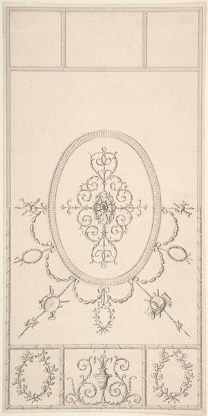 Curator: Let's discuss Jean-Jacques Feuchère's "Design for a Chandelier," circa 1835. It's a pencil drawing. What strikes you about it? Editor: The detail is amazing, especially given that it's just a sketch. The overall feeling is very ornate and…well, privileged, maybe? I mean, who needs a chandelier with cherubs and deer? How do you interpret this work? Curator: Exactly. Think about the social context of 1835. This wasn’t just lighting; it was a statement. These elaborate designs showcased wealth and power at a time of significant social inequality. Neoclassicism often served to legitimize those in power by associating them with the perceived order and grandeur of the ancient world. What does the inclusion of cherubs and deer evoke for you? Editor: I see. It feels almost propagandistic, projecting an image of innocence and harmony that probably didn't reflect reality for most people. The deer maybe speak to some idealised vision of the hunt? A world apart from urban life. Curator: Precisely! And the sketch format itself. It speaks to the process of design, a kind of ‘behind the scenes’ look that further mystifies the creation of such luxury. Do you think there's a deliberate intent here, or simply a reflection of the times? Editor: Probably a bit of both. Artists aren't separate from society, they're shaped by it. Maybe Feuchère wasn't actively trying to make a political statement, but the drawing still reflects the values and power structures of his era. Curator: Absolutely. Reflecting on it, understanding design as a form of rhetoric really opens up this seemingly simple drawing to a much wider range of interpretations. Editor: I agree. It's fascinating to see how even something as decorative as a chandelier design can reveal so much about social power dynamics.