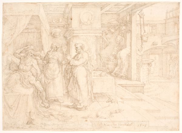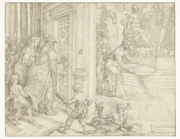 Editor: This is "Daniël vertelt Cyrus dat hij alleen de levende God en geen door mensen gemaakte afgodsbeelden kan aanbidden," a pen and ink drawing from 1564 by Maarten van Heemskerck, currently at the Rijksmuseum. I’m struck by how the artist captured the tension between Daniel and Cyrus in such delicate lines. What can you tell me about the power dynamics at play here? Curator: It’s a potent image, isn’t it? Consider the historical context: this is the 16th century, a period marked by religious reformation and iconoclasm. Van Heemskerck, deeply embedded in the intellectual circles of his time, uses this biblical scene to subtly comment on the dangers of idolatry. Look at how Daniel stands, not just preaching faith, but actively challenging the authority embodied by Cyrus. Where do you see echoes of contemporary debates about religious expression in this work? Editor: I hadn't considered that connection directly, but now I see it. Daniel is positioned almost as a dissenter challenging the establishment. Is the placement of the idols at Cyrus's feet a kind of...visual resistance? Curator: Precisely! These overthrown idols aren't just props; they represent the very real power struggle of choosing one’s beliefs amidst social and political pressures. The sketch makes an argument for religious self-determination at a time when Europe was at war about such ideas. Think of it in terms of modern activism, how do symbolic acts like these translate to today's societal challenges? Editor: So, this isn't just a historical depiction, it's a statement about cultural and political identity? That's amazing. Curator: Absolutely. Art is rarely created in a vacuum. By understanding the artwork through this intersectional lens we not only unpack the layers of the piece itself, but it allows us to think more deeply about our world. What resonates most with you after having looked at it in this way? Editor: How art can give us language to voice modern conflicts of identity.