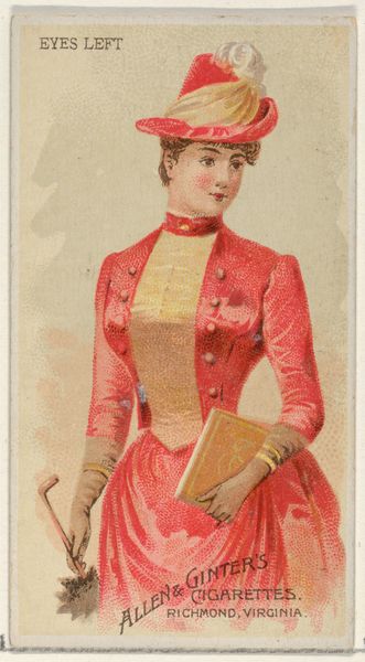 Curator: This charming piece is from a series of illustrated cards made in 1888 by Allen & Ginter Cigarettes. Titled "Wait for Escort," it was part of their "Parasol Drills" set. Editor: I’m immediately struck by the almost doll-like quality, there is something melancholic about it. All that pink…yet she seems less than thrilled. A strange mix, I find. Curator: The "Parasol Drills" cards depict women performing military-style drills with parasols. At the time, there were other brands that promoted all types of different products with series of collectible cards. Editor: That context definitely reframes her! So, it’s less portrait, more… propaganda? I wonder, how were women expected to see this? A fashionable form of civic engagement? Curator: Perhaps! Though many see them now as clever ways to subvert traditional gender roles and depict them doing atypical things, like paramilitary drills. I notice the rigid stripes of her dress almost mimic the straightness of the drill, don’t you think? Editor: Oh, absolutely. And yet, that elaborate hat, that dainty bow… it’s a paradox wrapped in pink! This makes me wonder, how intentional was this supposed subversion? Is that plausible? Curator: It's hard to say definitively what was intended. Cigarette cards were aimed at a broad audience, but the designers would have certainly been aware of changing perceptions of women and modernity at the time. But it also falls into the pattern of Victorian obsession with young, idealized images of femininity, don't you agree? Editor: A perfect collision of social aspirations and corporate strategy then! The "Wait for Escort" title now reads differently, almost like a coded plea within a playful military pose. How ingenious. Curator: Absolutely. These pieces from Allen and Ginter, are like time capsules offering a tantalizing glimpse into the complex social and cultural codes of their age. Editor: I see her in a whole new light now. A bittersweet vignette—waiting is active after all—laden with expectation and perhaps, a dash of playful resistance.