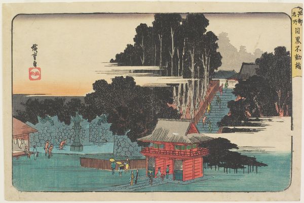 Editor: Here we have Hokusai’s "Zigzag Bridge in Mikawa Province," created sometime between 1830 and 1834, a woodblock print now housed in the Rijksmuseum. I find the composition so intriguing – it almost feels like a geometric puzzle nestled in a landscape. What stands out to you most about the formal elements at play? Curator: The most compelling aspect, structurally, is the play with perspective and line. Notice how the zigzag bridge dominates the foreground, its angularity sharply contrasting with the more fluid, organic shapes of the landscape behind it. This juxtaposition creates a dynamic tension, wouldn't you agree? Editor: Yes, the hard lines against the soft backdrop. It makes me wonder about the spatial relationships. Curator: Precisely. The artist uses a flattened perspective, common in Ukiyo-e, to compress the scene, bringing the background closer and disrupting traditional depth cues. Note, as well, the recurring motif of the rectangle and how it defines most of the elements—the bridge segments, the paddies, and even the chop mark containing the characters, don't you think? Editor: Now that you point it out, it's impossible to miss! The rectangles are really rhythmic. The colours are also very subtle - are there particular colour combinations that stand out to you? Curator: Observe how the muted blues of the water and sky bookend the earthy tones of the bridge and landscape. This restricted palette creates a sense of harmony while also directing our gaze to the intricate details of the bridge. Did you notice how certain blocks have grain more evident than others? That contrast is purposeful and draws one's attention further. Editor: That's a great catch; I was so focused on the composition I almost missed that texture detail. Curator: And it's through noticing details like that, the relationships, textures and forms, we come to understand more fully the complex, internal language of Hokusai’s work. Editor: I’m beginning to see this print in a whole new light - understanding the significance of the formal decisions, such as flattened perspective and colour harmonies, changes the entire viewing experience. Curator: Agreed. Approaching art from this angle makes its own interesting landscape—one of shapes and lines, negative spaces and volumes, tones, forms and structures, and one that is always rewarding to consider and discover.