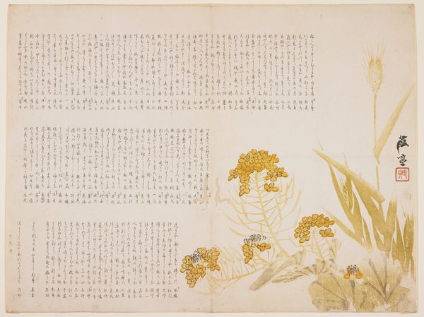 Editor: Here we have Shibata Zeshin's "Spring Field with Mt. Fuji View," made around 1858 using ink and color on paper. The pale washes of color and faint outline of the mountain give it a feeling of ethereal distance, a delicate but firm assertion of the natural world, despite the dominant blocks of script. What strikes you most about this piece? Curator: The visual tension between the seemingly detached mountain and the assertive script demands interrogation. Are they truly separate, or does one inform the other? I find myself considering the place of landscape within the Edo period's complex social hierarchies and its function in nationalist and imperialist ideologies, and questioning the function of this ‘personal sketchbook’ entry in reinforcing or resisting those systems. Do you get a sense that the writing constrains, grounds, or perhaps even elevates the imagery of Mount Fuji and the surrounding botanicals? Editor: That’s fascinating. I hadn't considered the social context so directly. To me, the writing felt like a field-note type observation; part of an artist’s process of noticing what they are surrounded by. So perhaps an attempt to possess and control their environment through words, or even democratize it by combining a famous, monumental subject (Fuji) with ordinary observations? Curator: Exactly! The relationship becomes charged when viewed through lens of power, whether class, artistic schools, or state influence. How does Zeshin situate *himself*? The choice to juxtapose landscape and text begs examination. Consider the act of drawing itself as an assertion, one that implies an interaction with, and perhaps an attempt to influence, both natural and social environments. Editor: I see that connection more clearly now, especially when thinking about landscape as not just scenery, but a site of cultural and political meaning. Thanks. I'm now considering what questions this might provoke around land rights, natural resources, and indigenous rights. Curator: Wonderful. We have perhaps arrived at the key concept: art historical analysis prompts us to understand artworks as reflections of and participants in ongoing dialogues about our places within society.