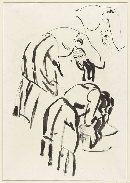 Editor: Here we have "Woman in Dress Seated on Armchair with Left Arm Raised," a pen and ink drawing, made by Mark Rothko. The stark lines feel almost frantic, don't they? What strikes you most about the materiality and production of this image? Curator: The apparent speed and roughness are crucial. Look at the directness of the ink on paper. What kind of labor went into this? Was this a preliminary sketch, a study, or a finished piece? It challenges the conventional hierarchy, where drawing is often seen as subservient to painting or sculpture. How does this potentially undermine capitalist art valuation practices, where “finish” often equates value? Editor: That’s a great point. The unfinished quality almost feels like a conscious rejection of the market's demands. Do you think the domestic setting – the woman in an armchair – adds another layer to that commentary? Curator: Absolutely. The choice of subject reinforces the challenge to established values. Domestic life, often associated with women’s unseen and unpaid labor, enters the frame. The sitter's gesture seems nonchalant, informal, a departure from traditional, posed portraits, suggesting a different value system entirely, one less reliant on grandeur and display, and closer to something more egalitarian. Does it succeed? Editor: I'm starting to see the connection between the rapid execution, the domestic scene, and this resistance to the traditional art market. Rothko’s choice of medium, a simple ink drawing, is in itself a challenge. Curator: Precisely! It's not just what is depicted, but how it's made and the conscious decision of the artist to prioritize labor that defies the existing consumerist culture. Editor: It’s really amazing how much can be unpacked simply by focusing on the materials and the means of production. Curator: It is, and remember, it’s an ongoing critical project. Keep questioning the role of the artist’s hand and the societal forces that shape artmaking.