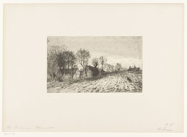 Curator: We’re looking at Auguste-Louis Lepère’s etching from 1913, titled "The Road to Houssoye," which resides here at The Art Institute of Chicago. Editor: There's a stark, almost blinding light emanating from the horizon, which gives the work a sort of dreamy, ethereal quality. The dirt road itself has a palpable materiality though, like you could almost feel the ruts. Curator: Right, Lepère really captures the textures here with his skillful etching. It’s interesting how he balances that strong light with such grounded, earthly details, isn't it? What I find fascinating is that, by manipulating the density of the etched lines, Lepère actually gives a sense of atmospheric perspective in what could otherwise be just another rural landscape. Editor: Absolutely. And that density also speaks to the labor involved in etching—the physical act of repeatedly scoring those lines into the metal plate, inking it, pressing it… you can sense the hand of the artist, the grit of the workshop. There's something satisfying about the tangible process informing this ephemeral feeling of light. Curator: Yes! Almost like the material reality grounds the intangible feeling that rises to meet the atmosphere, that reaches for some larger and perhaps sublime impression. To me, it almost asks the viewer to find their grounding amidst a somewhat bewildering life. Editor: It reminds me how materials dictate aesthetics. Consider if Lepère had used a less demanding medium – a charcoal sketch, for example. It simply couldn't embody the labor in the same way. Curator: That's so true. I wonder what Lepère himself felt walking that road... the journey, the purpose, or perhaps the lack thereof, the quiet anticipation or a deeper kind of soul-searching. It invites a lot of contemplation. Editor: It truly does. It encourages us to consider the conditions that birthed this image: The artist's toil, the rise of industrial printing, and the slow pace of the world he depicts versus our breakneck speed now. There are multitudes etched within these lines. Curator: It's a world contained in a rectangle that transcends a single viewing. Editor: Indeed, a reminder of how profoundly process can shape our perception.