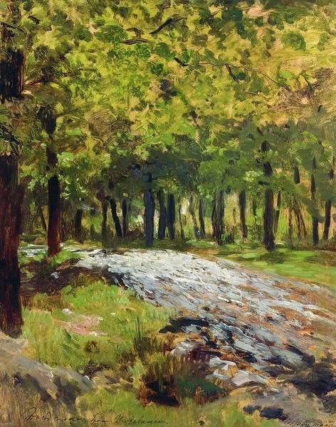 Konstantin Makovsky created "Under the Green Trees (Summer Landscape)" using oil paints to capture a vivid impression of the natural world. The materiality of oil paint is key here; its ability to blend seamlessly allows Makovsky to create soft transitions between light and shadow. You see it particularly in the foliage, where a multitude of greens melt into one another. It is the texture of the brushstrokes themselves that give life to the scene, imbuing the landscape with a sense of vitality and movement. Makovsky’s technique is rooted in a tradition of close observation, but also the skilled application of materials. His artistic training, no doubt, honed his ability to capture the subtle nuances of light and atmosphere, reminding us that even the most seemingly straightforward landscape painting is the result of careful craftsmanship. Appreciating the artist’s mastery of materials and techniques allows us to see beyond the surface of the image, revealing the depth and complexity of the natural world.